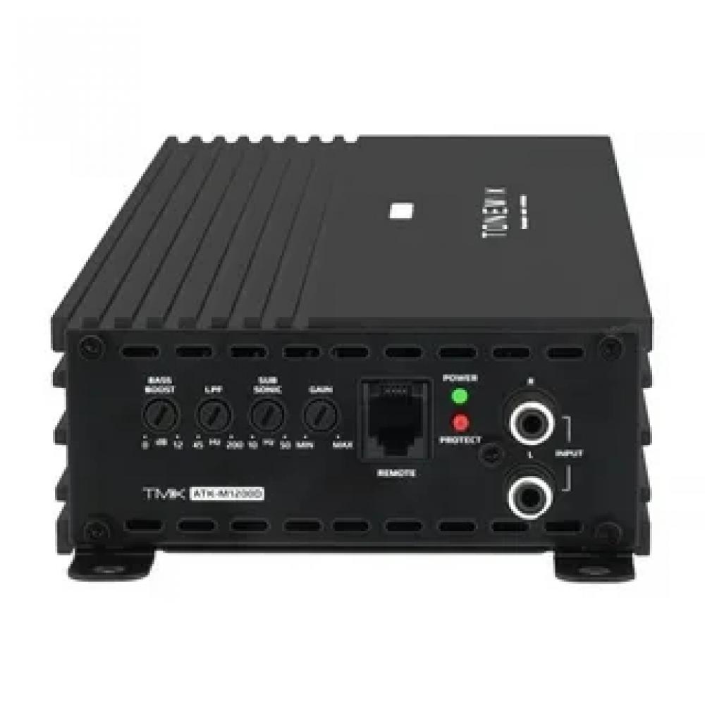 Tonemix ATK‑M1200D — это моноусилитель класса D для сабвуферов, рассчитанный на 400 Вт RMS при 4 Ом, 650 Вт RMS при 2 Ом и до 1000–1200 Вт RMS при 1 Ом. Он оснащён встроенным фильтром низких частот (45–200 Гц), сабсоником (10–50 Гц), регулировкой баса и выносным пультом управления.