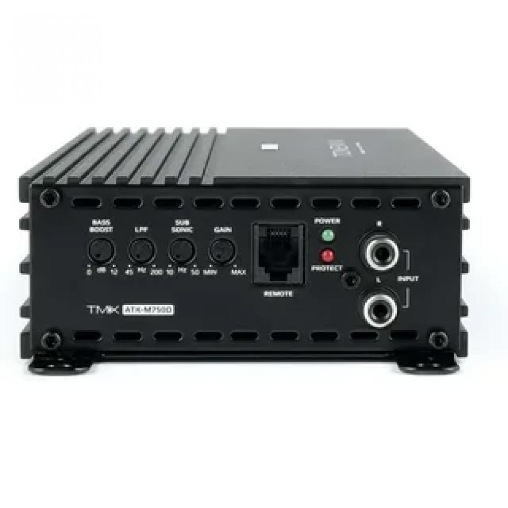 Tonemix ATK‑M1200D — это моноусилитель класса D для сабвуферов, рассчитанный на 400 Вт RMS при 4 Ом, 650 Вт RMS при 2 Ом и до 1000–1200 Вт RMS при 1 Ом. Он оснащён встроенным фильтром низких частот (45–200 Гц), сабсоником (10–50 Гц), регулировкой баса и выносным пультом управления.