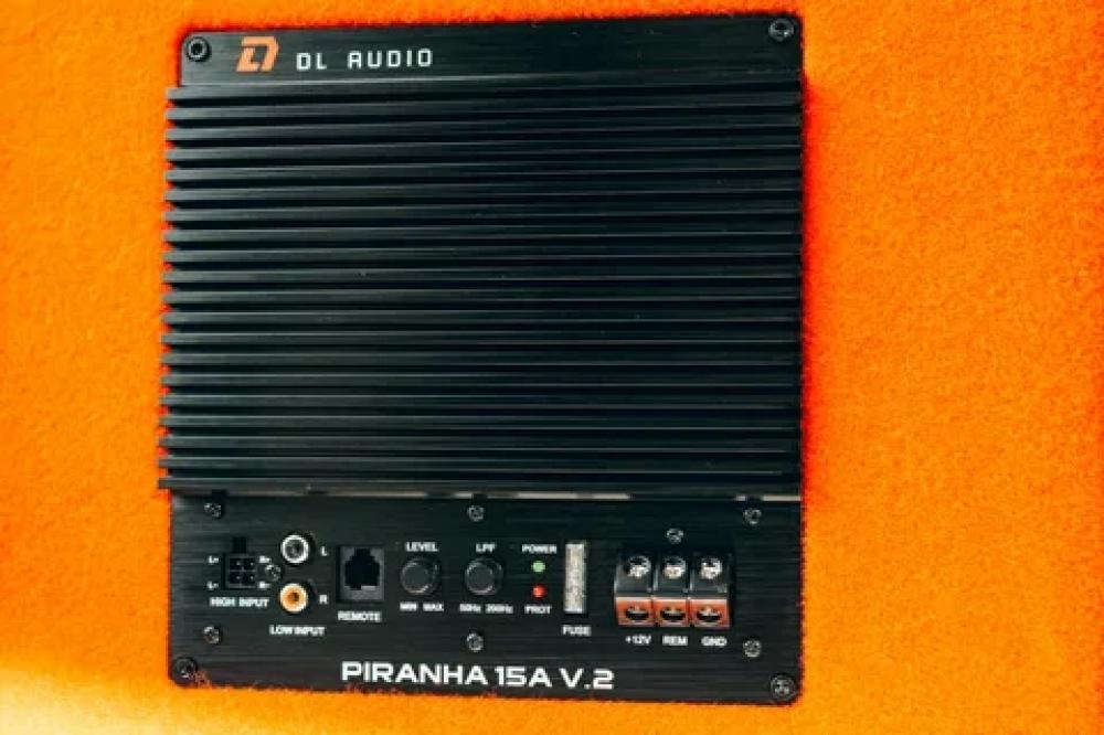 Корпусной активный сабвуфер DL Audio Piranha 15A Orange V.2 — это мощный 15‑дюймовый фазоинверторный сабвуфер с встроенным усилителем, рассчитанный на 1000 Вт максимальной мощности, частотный диапазон 20–230 Гц, с фильтром НЧ и дистанционным управлением уровнем